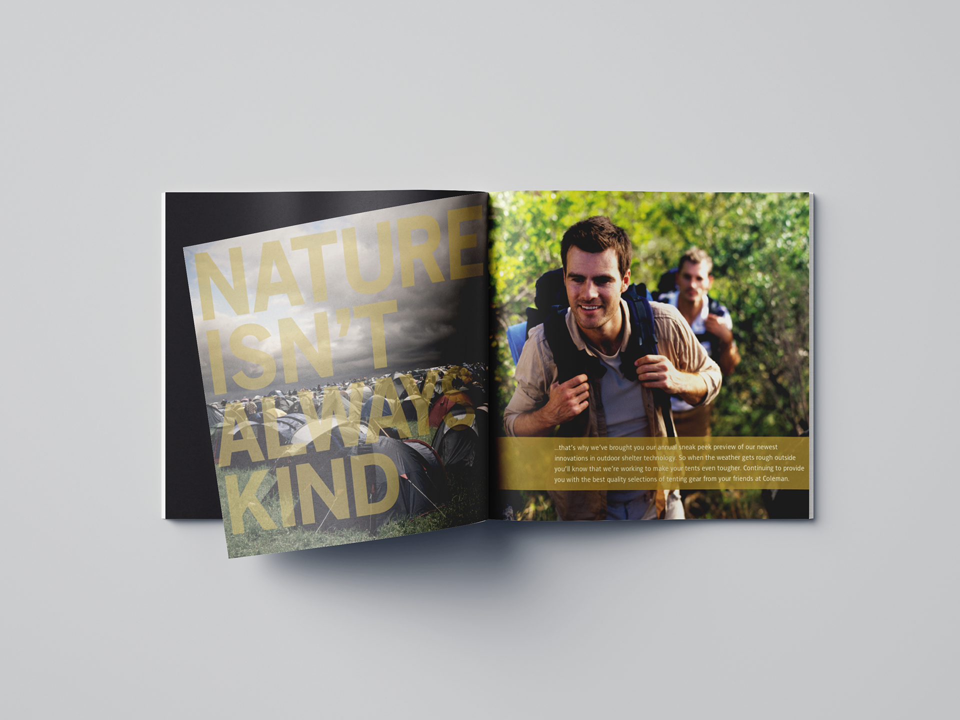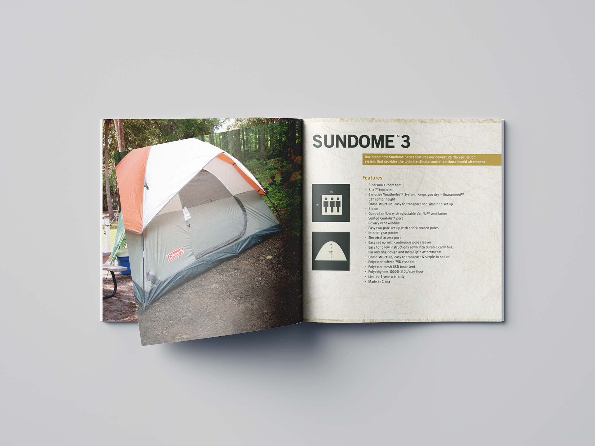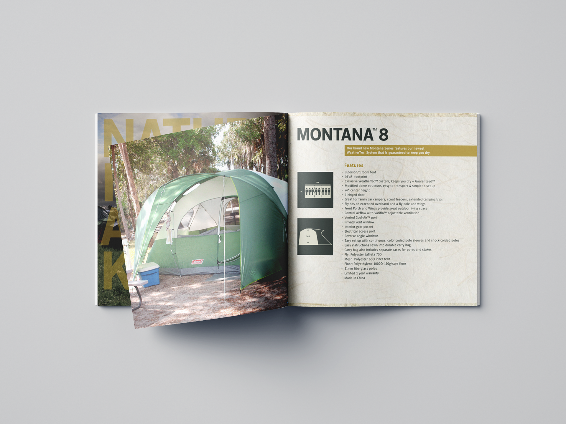 Designed a promotional catalog showcasing upcoming tent products from Coleman, highlighting key features and outdoor lifestyle appeal. The presentation folder also includes a branded business card, providing consumers and retailers with essential contact details and company information to strengthen brand connection and support sales efforts.